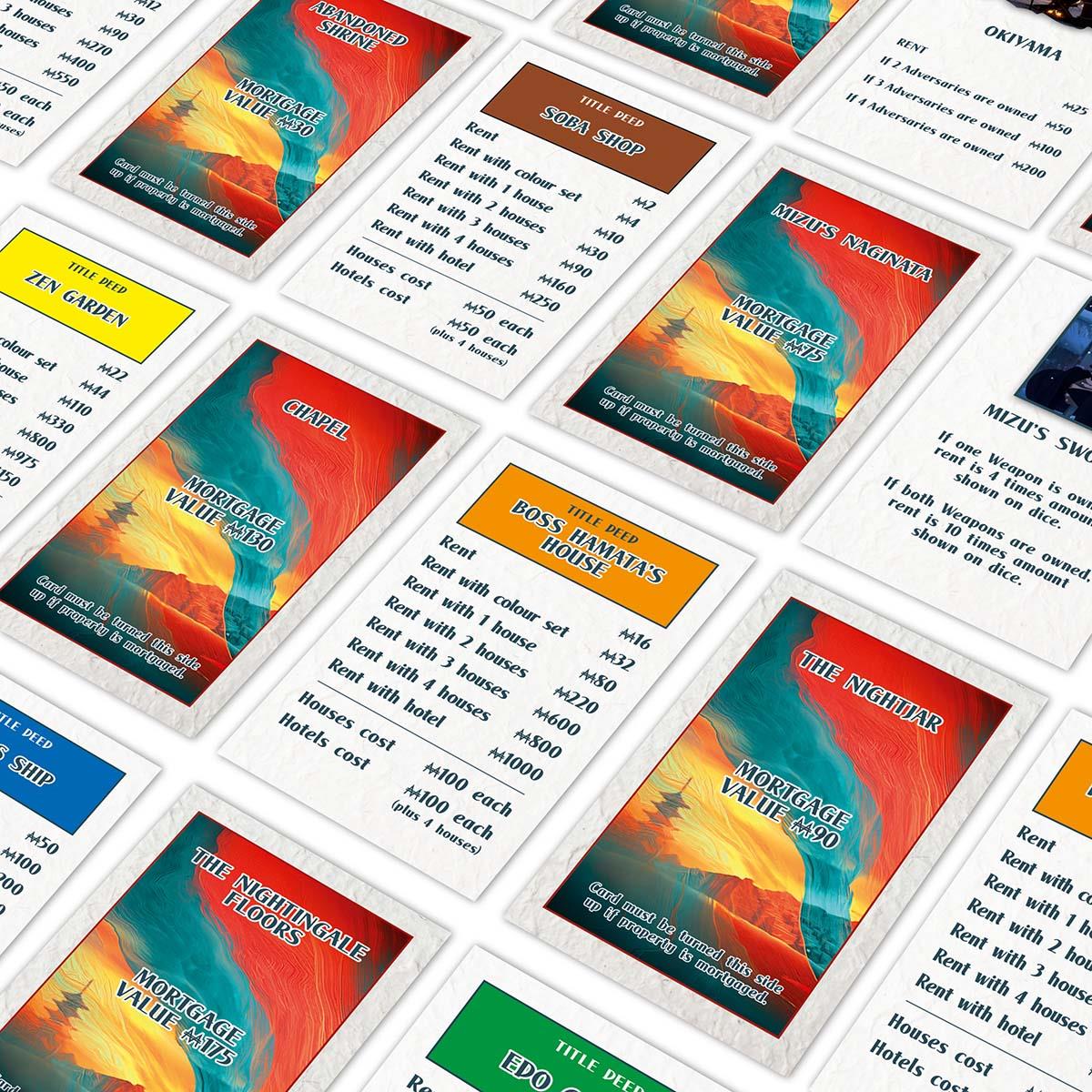 - BUILD YOUR BLUE EYE SAMURAI EMPIRE: Buy up colour sets and use your BLUE EYE SAMURAI themed Monopoly money to expand your empire by building houses and hotels