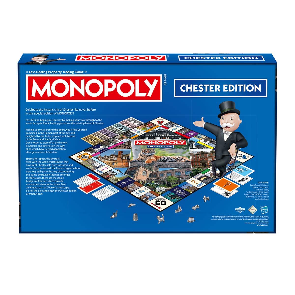 Discover Chester's rich history and charm with every roll of the dice in this special Chester City edition of MONOPOLY! Embark on a journey through centuries of heritage, where every turn reveals iconic landmarks, historic shops, and breathtaking views of the city that has stood the test of time. Begin at the renowned Eastgate Clock and travel through the ancient Roman walls, Tudor-inspired Rows, and iconic Chester landmarks. As you acquire property, build your empire amidst Chester's famous watchtowers, quaint boutiques, and centuries-old eateries. Beware of the Roman Legion and school trips that add playful obstacles to your path! With every space, you’re not just playing a game – you're walking through Chester’s unique story.