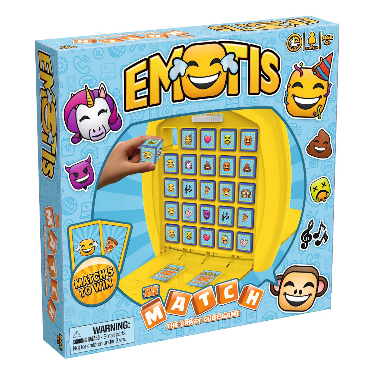 Top Trumps Match, the Crazy Cube Game, gets emotified! Match five Emoti cubes to win in this game of five in a row featuring hearts, unicorns and poop among 15 of social media's most popular Emotis! It's portable, so you can take it with you wherever you go and have a Emoti game like no other, with Top Trumps Match!