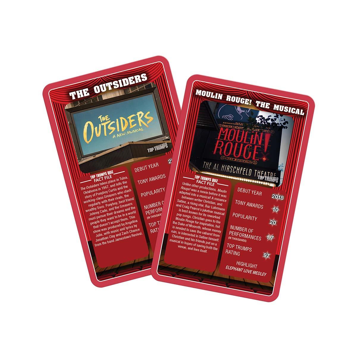 Bring the magic of the stage to your game night with the Top Trumps Musicals Limited Edition Card Game – the ultimate collectable for theatre fans and families alike. Featuring 30 of the greatest Broadway and West End musicals, from timeless classics like Oklahoma! and Chicago to modern sensations like Hamilton and The Outsiders, this game is a must-have for any stage enthusiast. Discover fascinating facts about legendary productions, cast members, awards, and record-breaking performances while competing with friends and family. Will The Lion King roar to victory with its breathtaking performances, or will Cats claim the crown with its show-stopping run? Packed with trivia, stats and iconic moments from musical theatre history, this card game is educational, portable, and endlessly entertaining. Perfect for travel, family game nights, or as a gift for theatre lovers, the Top Trumps Musicals Limited Edition pack combines learning and laughter in one dazzling deck. Outsmart your opponents, explore the magic of Broadway, and become the true Top Trump of the stage.