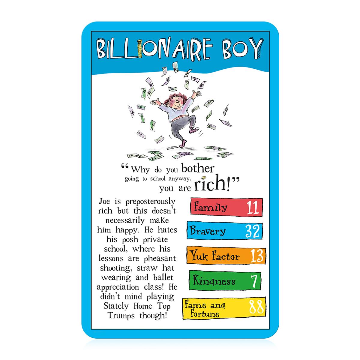 Discover which of your favourite David Walliams books has the best moment in this Top Trumps card game featuring scenes from Gangsta Granny, Ratburger, The Boy in the Dress, Awful Auntie, Billionaire Boy, Mr Stink and Grandpa’s Great Escape! Play The World of David Walliams Top Trumps, the educational card game, and see if Mr Stink’s earplugs or Stella’s poltergeist-ing tricks has the most yuk factor, or if Armitage or Raj has the most kindness. Whatever your favourite book or character is, The World of David Walliams Top Trumps is the game for you!