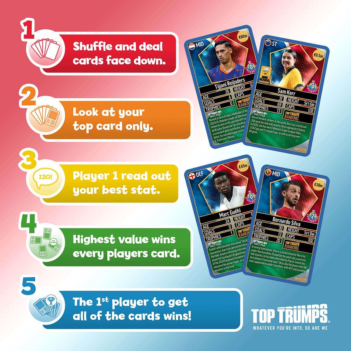 Battle it out by comparing key stats including Age, Goals, Trophies, Height, Caps and official Top Trumps ranking to determine who comes out on top. Every card also includes a Top Trumps Quiz fact file, packed with interesting insights about each player’s career achievements.